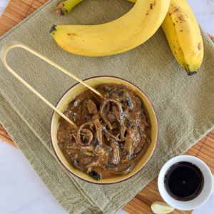 Pour varier les plaisirs, vous pouvez remplacer la purée de cacahuète par un peu de concentré de tomate, et retirer dans ce cas le gingembre. Mais ce que je vous conseille surtout, c’est de faire revenir les peaux de banane avec du tempeh et/ou un peu d’oignon émincé, avant d’ajouter la sauce. Ou faire dorer le tempeh à part et l’ajouter à la fin, c’est vous qui voyez. C’est délicieux et le tempeh apporte des protéines. Selon la quantité de tempeh et/ou d’oignon, et selon si vous avez envie de beaucoup de sauce ou pas, il faudra peut-être augmenter la quantité de cette dernière. 😌