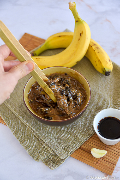 Je sais que ça peut surprendre, mais oui, oui, la peau de banane peut se consommer ! On choisira des bananes biologiques, évidemment. Je ne pense pas toujours à le préciser, car ma cuisine est 100 % bio ou assimilée. C’est la base pour moi, la question ne se pose pas : une alimentation saine, bonne pour soi et pour la planète, c’est une alimentation non pesticidée/engraissée chimiquement. Ainsi, je peux consommer la peau de tous les fruits et les légumes sans souci. 🙂