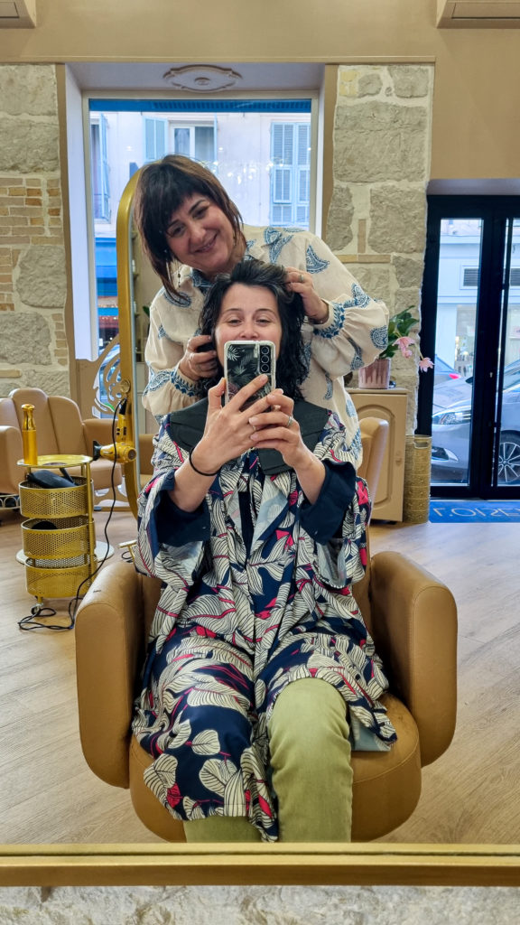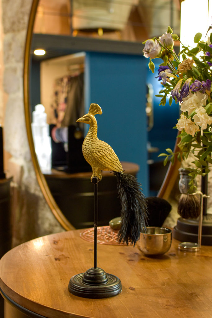 J’ai demandé par curiosité la genèse du nom et de l’image de marque à Nathalie. Cette dernière m’a expliqué que ça lui est venu parce qu’elle adore le paon, qui est un oiseau protecteur, notamment en Inde où il est souvent associé aux déités. Elle est aussi très sensible à la géométrie sacrée, ajoutant que l’œil de paon représente pour elle ce que l’on peut voir de plus beau dans la nature, avec une géométrie parfaite. Mais c’est un oiseau qui a un peu d’égo, m’a-t-elle confié. Donc elle ne voyait pas le paon tout seul symboliser le salon de coiffure, il y avait cet égo qui la gênait.