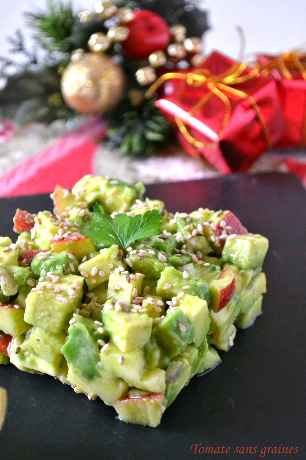 Il s’agit d’une entrée sucrée-salée à base d’avocat, de pomme et d’échalote… mais aussi de vanille, la petite touche qui fait toute la différence ! ^^